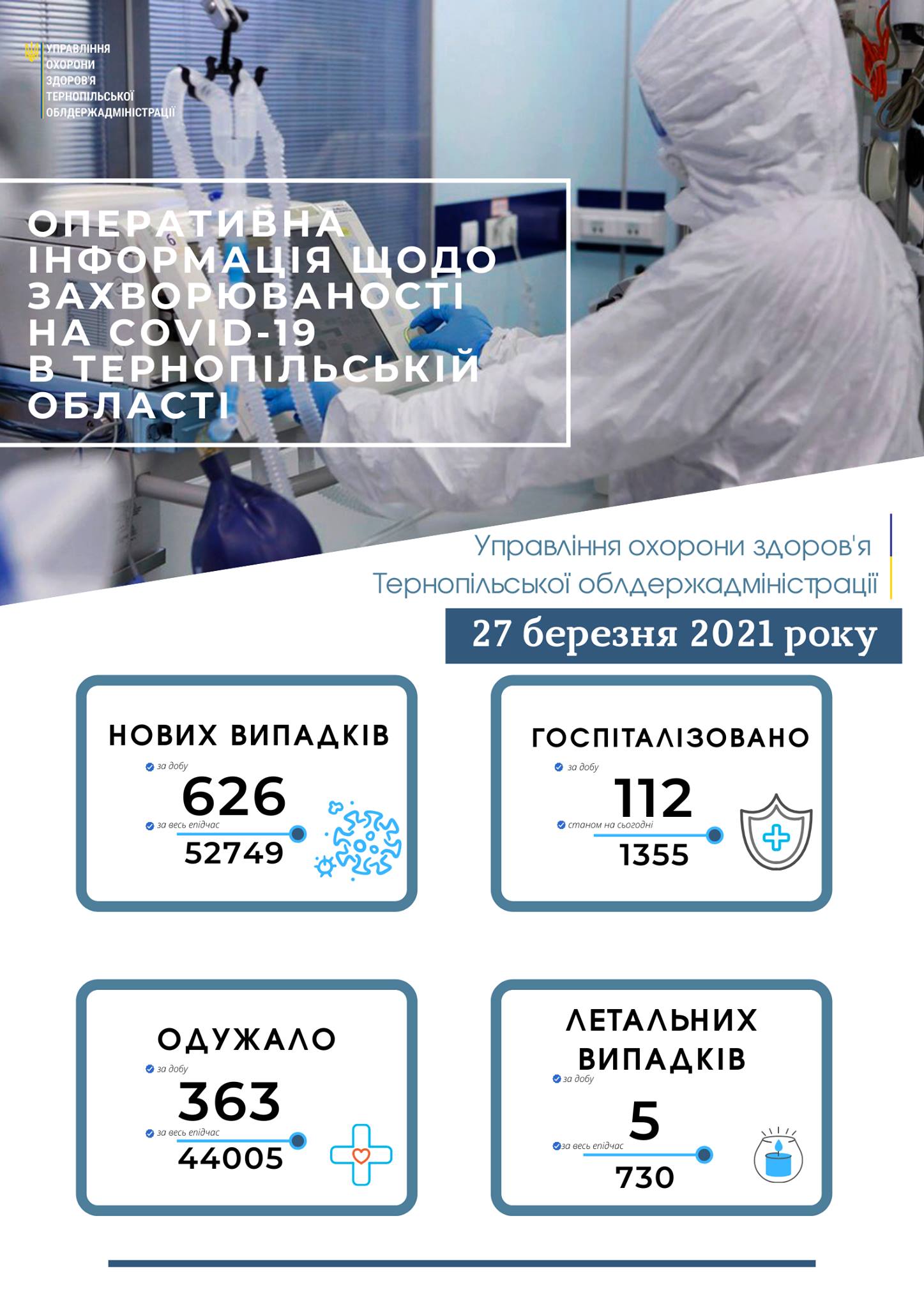 Всього з початку вакцинації: в Тернопільській області першою дозою щеплено 9937 людей, двома дозами - одну людину; в Україні - 196879 особи, з них отримали першу дозу – 196878 особи, завершили вакцинацію (отримали 2 дози) – 1 особа.