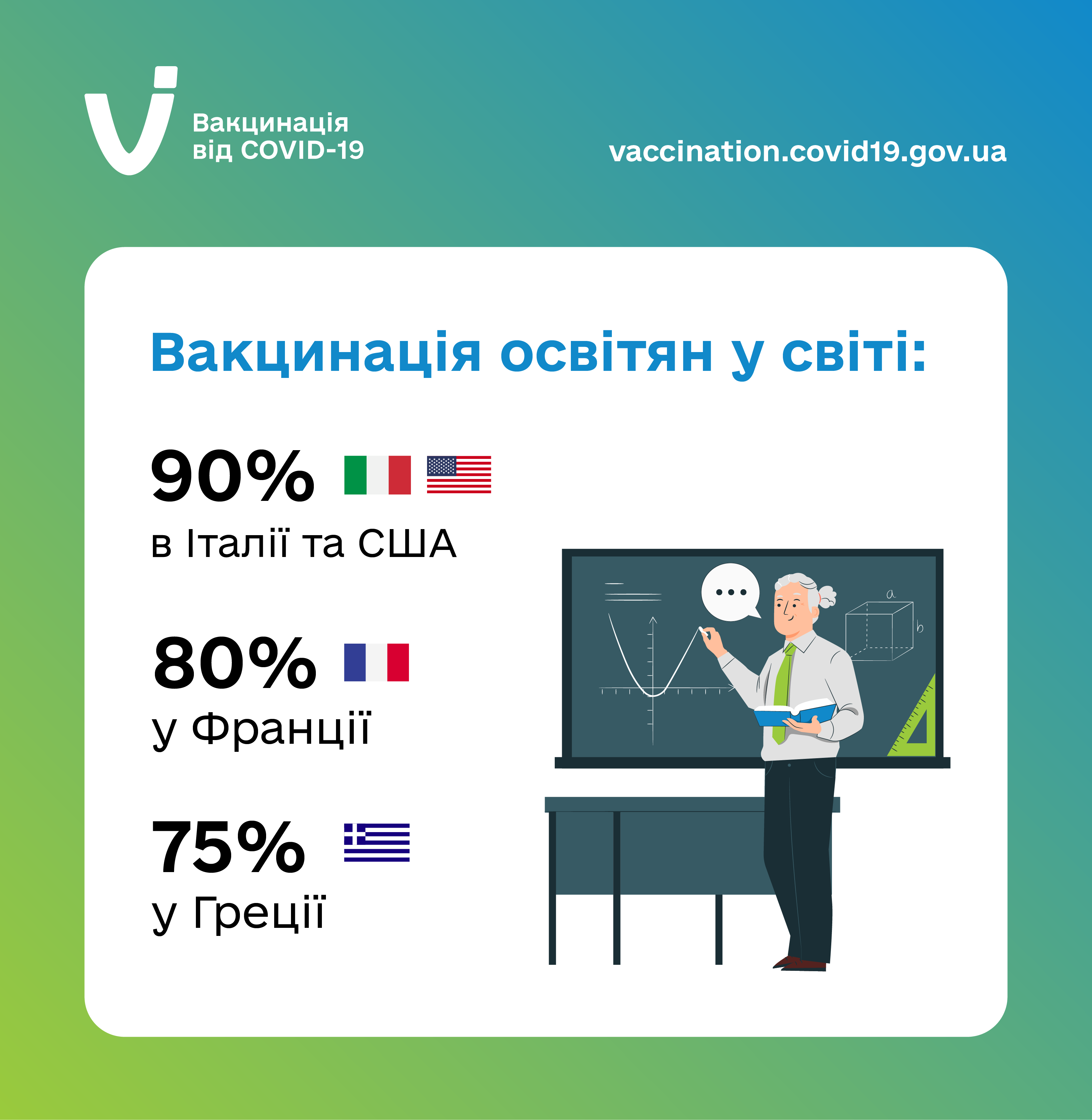 Освітяни всього світу вакцинуються, щоби розпочати новий навчальний рік безпечно.В Італії та США близько 90% працівників сфери освіти отримали щеплення від COVID-19, у Польщі та Франції таких педагогів понад 80%, а у Греції – майже 75%.